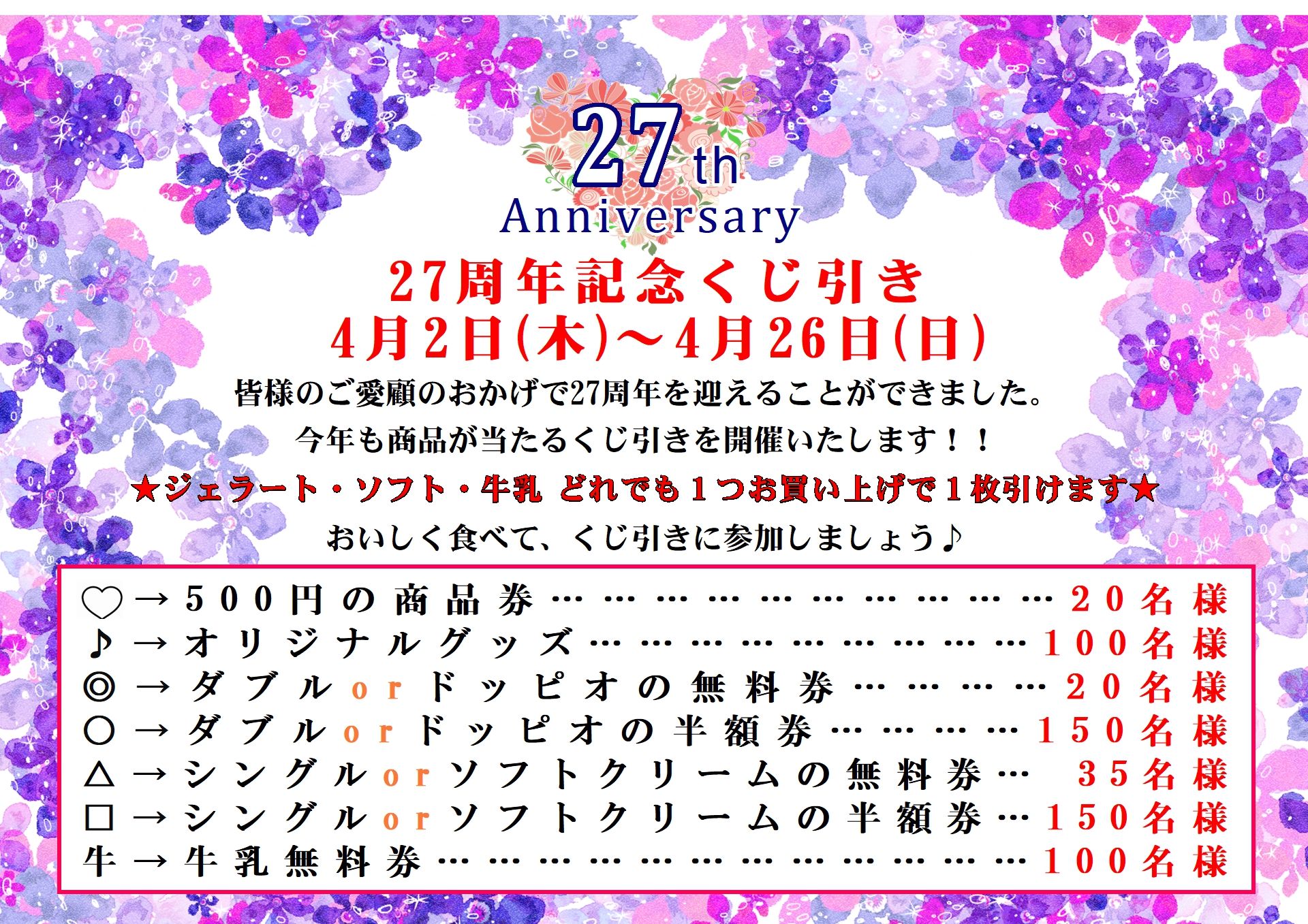 【2026】27周年記念くじ引き開催中♪【~4月26日まで】